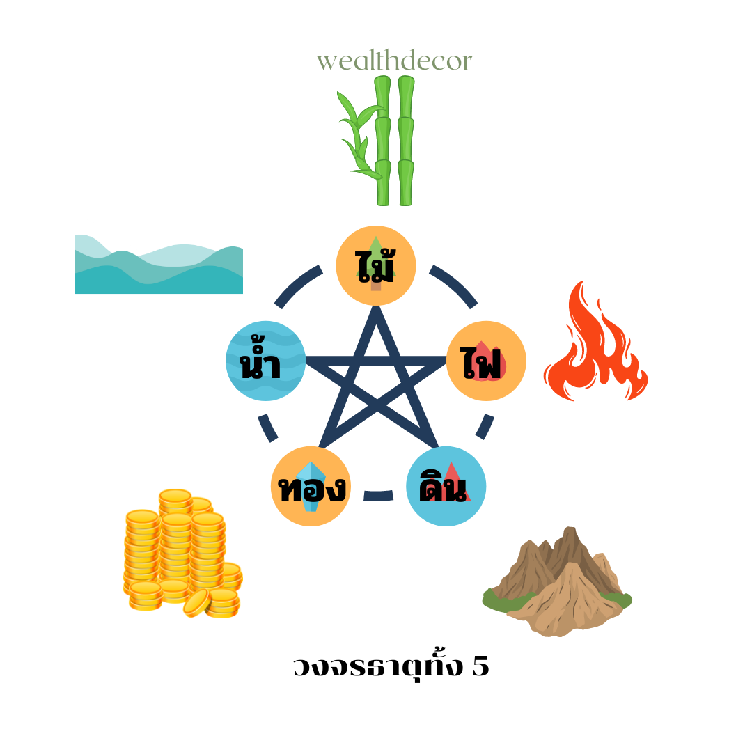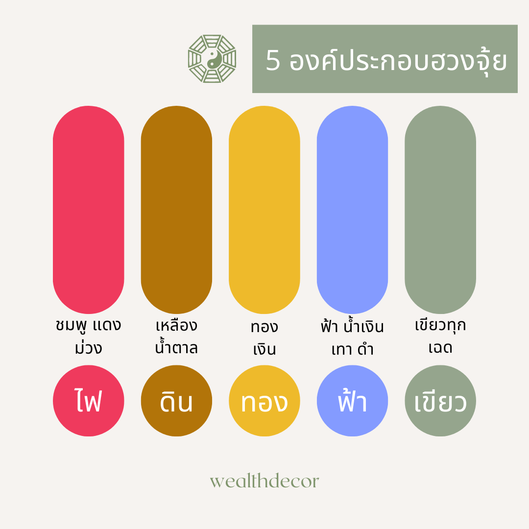 ห้าธาตุที่แตกต่างกันในทางฮวงจุ้ย ได้แก่ ดิน น้ำ ทอง ไฟ และไม้ แต่ละองค์ประกอบหมายถึงลักษณะทางธรรมชาติและความเชื่อมโยงซึ่งกันและกัน