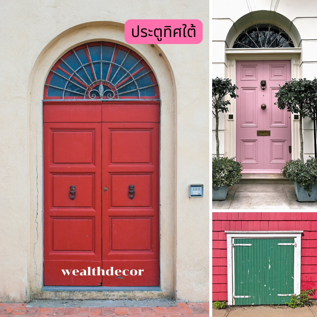 ประตูบ้านหันทางทิศใต้ เป็นทิศของธาตุไฟ ช่วยเสริมพลังงานให้มีชื่อเสียง ภาพลักษณ์ที่ดี ได้แก่ สีแดง สีชมพูและสีม่วง