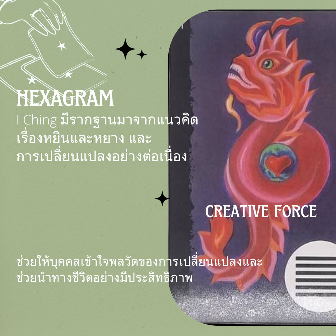 การเปลี่ยนแปลง:หัวใจสำคัญของ I Ching คือแนวคิดที่ว่าทุกสิ่งอยู่ในสภาพของการเปลี่ยนแปลงอย่างต่อเนื่อง รูปหกเหลี่ยมและเส้นที่เปลี่ยนแปลงเป็นสัญลักษณ์ของธรรมชาติของการดำรงอยู่ที่เปลี่ยนแปลงตลอดเวลา การให้คำปรึกษา I Ching ช่วยให้บุคคลเข้าใจพลวัตของการเปลี่ยนแปลงและวิธีการนำทางอย่างมีประสิทธิภาพ