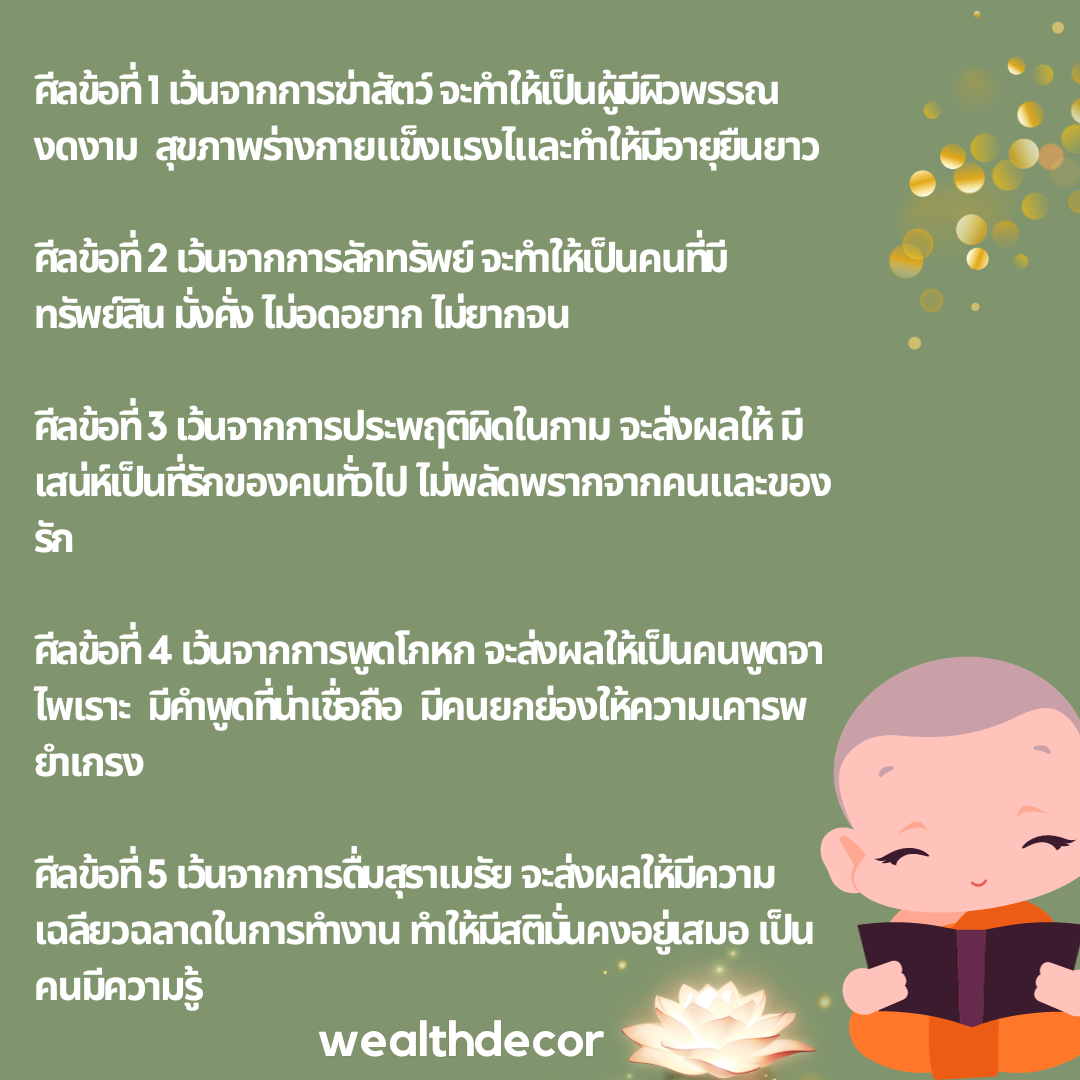 ศีลข้อที่ 1 เว้นจากการฆ่าสัตว์ จะทำให้เป็นผู้ มีร่างกายสมส่วน ผิวพรรณงดงาม เป็นที่รักของทุกคน สุขภาพร่างกายแข็งแรงไม่มีโรคภัย และทำให้มีอายุยืนยาว