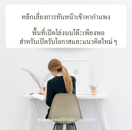 จัดระเบียบโต๊ะทำงานของคุณ : ความรก และยุ่งเหยิง ทำให้การไหลเวียนของพลังงานซบเซา จัดโต๊ะให้เป็นระเบียบและเป็นระเบียบเพื่อส่งเสริมความชัดเจนของจิตใจและวัตถุประสงค์