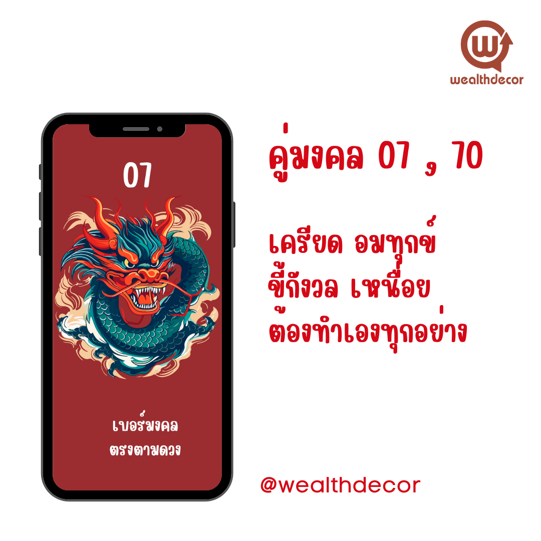 เลขคู่มงคล 07,70 เลขแห่งความเครียด ความกังวลใจ เก็บกด คิดมาก จริงจังกับชีวิตมากเกินไป พบเจอแต่ปัญหาและอุปสรรค มีความทะเยอทะยาน ความโลภสูง เป็นเลขใช้แรงงาน เหนื่อย อดทน ทำงานหนัก รวยยาก ต้องรับผิดชอบครอบครัวและต่อสู้กับปัญหามากมาย ไม่ควรใช้เลขนี้