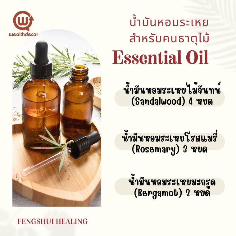 การใช้น้ำมันหอมระเหยเป็นวิธีหนึ่งที่สามารถช่วยปรับสมดุลพลังงานในร่างกายและสิ่งแวดล้อมรอบตัวเราได้ โดยเฉพาะเมื่อเรานำหลักฮวงจุ้ยเข้ามาประยุกต์ใช้ในการเลือกกลิ่นที่เหมาะสมกับธาตุของแต่ละบุคคล ซึ่งธาตุทั้ง 5 ได้แก่ ธาตุไม้, ธาตุไฟ, ธาตุดิน, ธาตุโลหะ (ธาตุทอง) , และธาตุน้ำ มาลองทำความรู้จักกับสูตรน้ำมันหอมระเหยที่เหมาะสมกับแต่ละธาตุกันดีกว่า