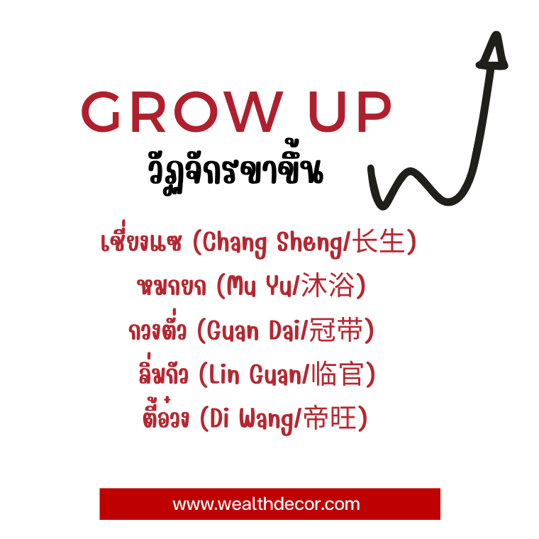 กวงตั่ว (Guan Dai/冠带) - "เติบใหญ่": เป็นช่วงที่พลังงานเข้าสู่ช่วงวัยหนุ่มสาว เต็มไปด้วยพลังและความกระตือรือร้น เหมือนกับการก้าวเข้าสู่วัยผู้ใหญ่ตอนต้น